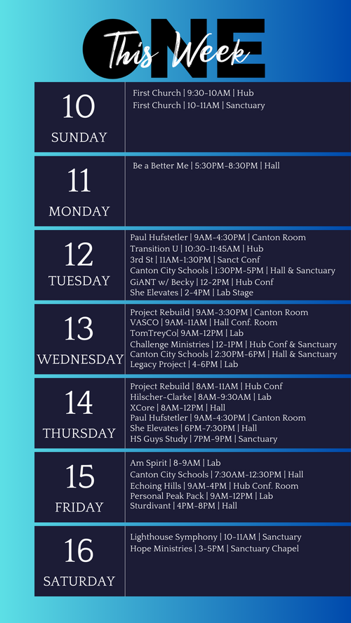 Check here every week to see what is going on at The One Center for Leadership! Notice something is not right or looking to book a room for yourself or your organization? Send Abby an email below!